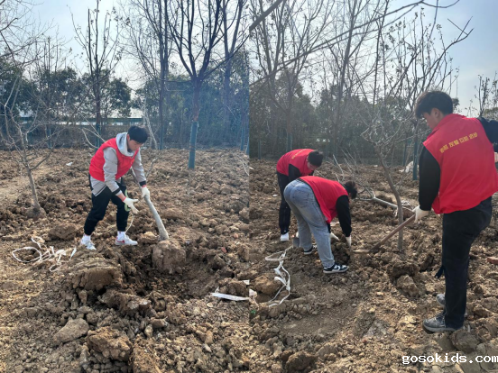 在合理分工后,同学们有条不紊地开始行动。只见,“挖机”分队的队员们挥动铁铲,松土挖坑;“护苗”分队的队员们抗起树苗,精准入坑;“养护”分队的队员们拿起桶盆,浇灌到位。经过挖坑、入坑、回填、浇水等一系列流程,同学们成功栽植了25棵树苗。
